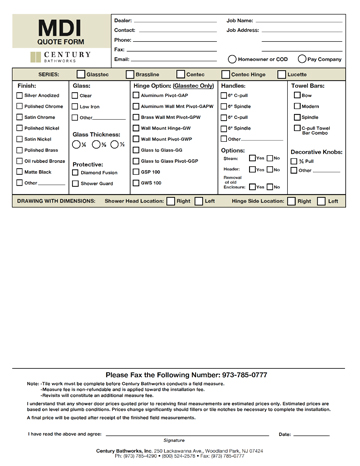 Use the appropriate form as a guide if you’re doing your own measuring and return it to an authorized Century Bathworks dealer. Your dealer can discuss your options with you and provide you with a quote. We do not sell directly to the public so we can only accept Measuring Guides from our authorized dealers.